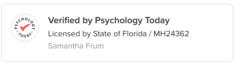 My name is Samantha Frum. I am a National Certified Counselor and Licensed Mental Health Counselor in the state of Florida. I have 8 years of experience working with adolescents, families, and young adults with a wide range of challenges.